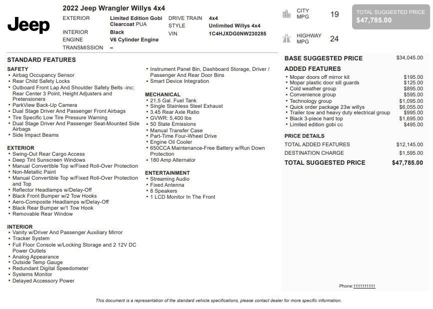 Jake Sweeney Is Here to Help! If you are in need of a new or used vehicle, we are offering you the ability to shop online and have your vehicle delivered to your home. Limited Edition Gobi Clearcoat 2022 Jeep Wrangler Unlimited Willys 4WD 6-Speed Manual 3.6L V6 24V VVT