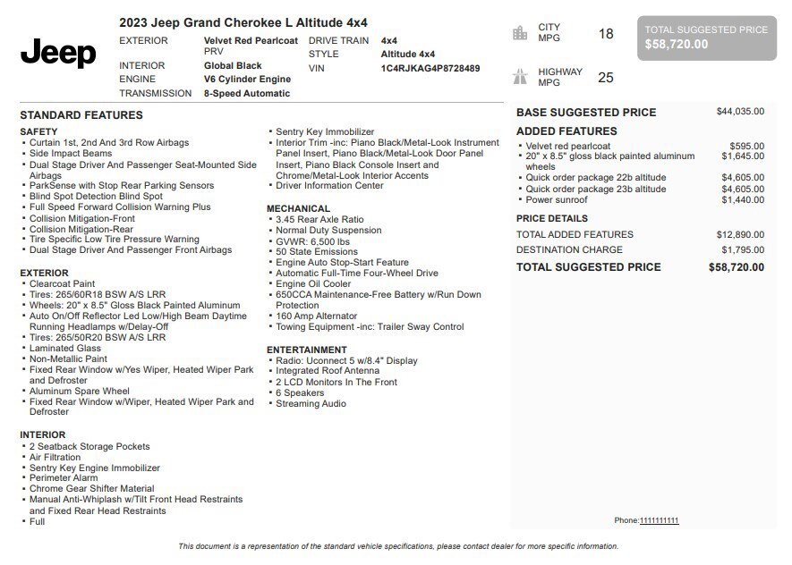 Jake Sweeney Is Here to Help! If you are in need of a new or used vehicle, we are offering you the ability to shop online and have your vehicle delivered to your home. Velvet Red Pearlcoat 2023 Jeep Grand Cherokee L Altitude 4WD 8-Speed Automatic 3.6L V6 24V VVT